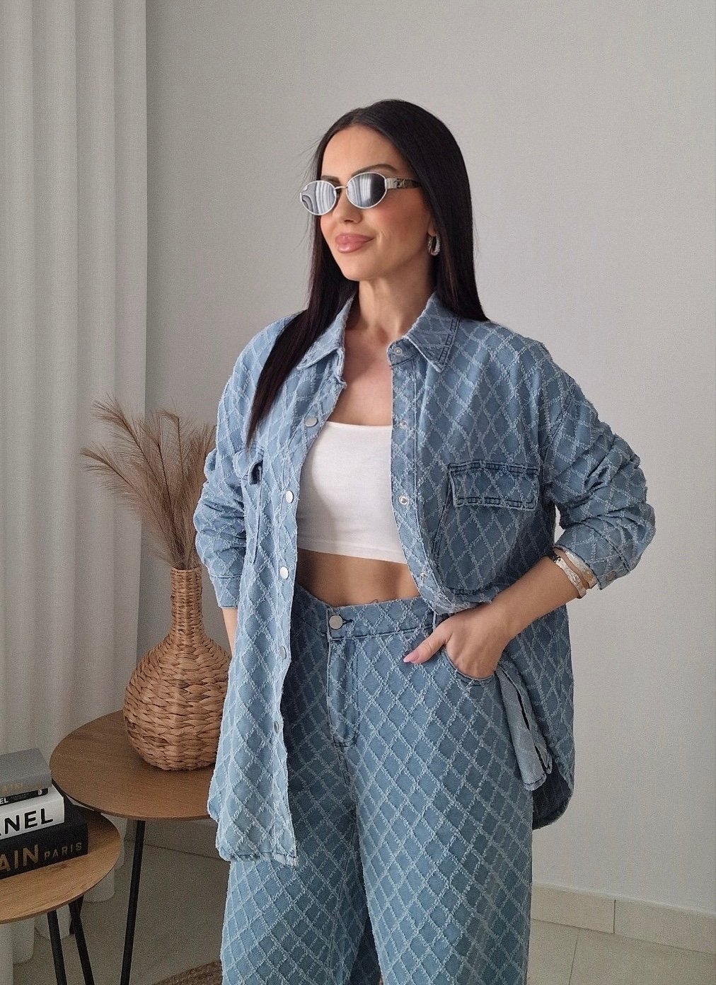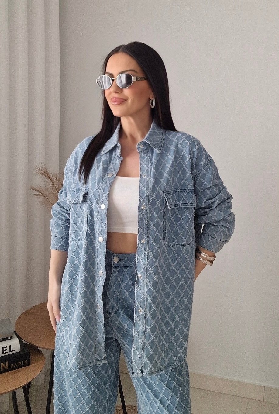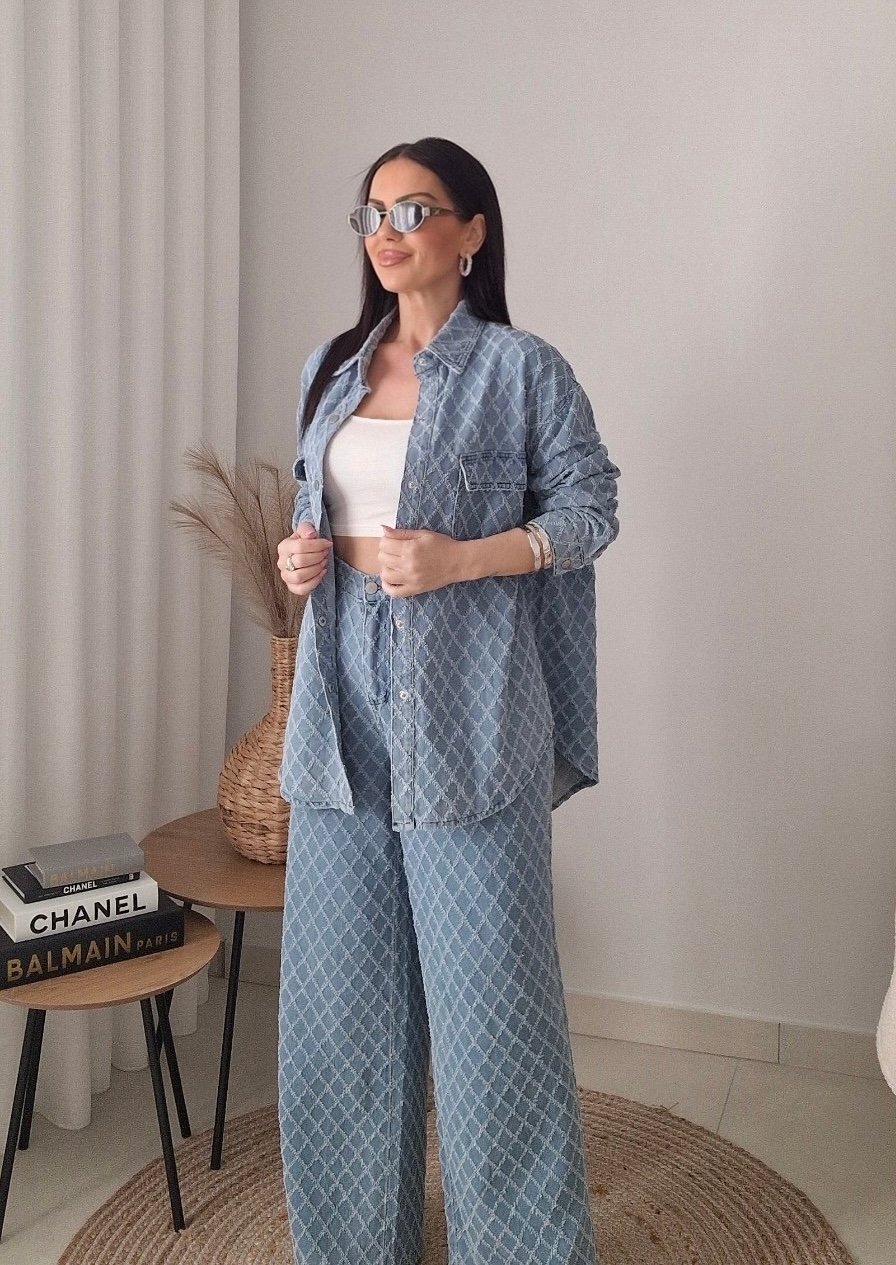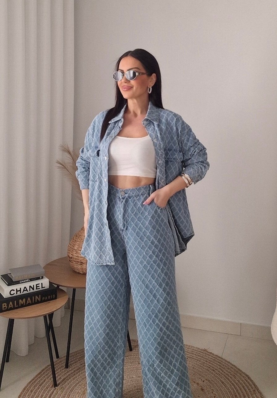 Oversized denim set σε υπέροχη απαλή μπλε απόχρωση με διακριτικό μοτίβο, που συνδυάζει άνεση και στυλ με τον πιο effortless τρόπο.