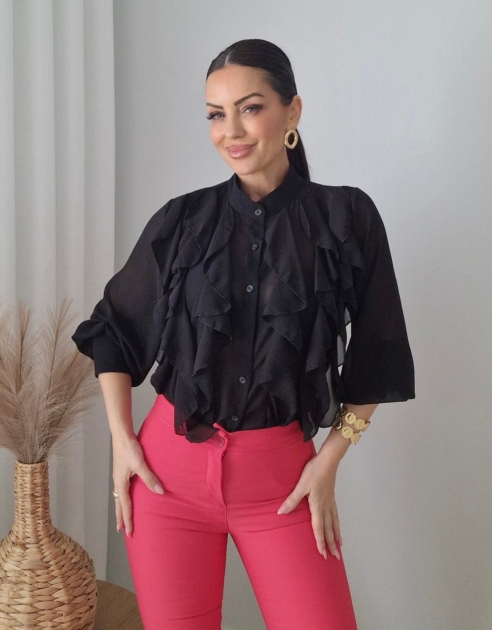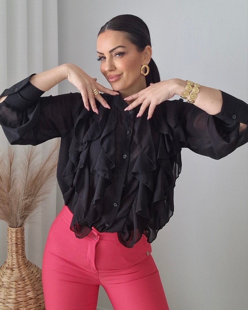 Ρομαντικό και κομψό πουκάμισο σε απαλό ροζ χρώμα που χαρίζει θηλυκότητα και στυλ σε κάθε εμφάνιση. Διακοσμημένο με εντυπωσιακά βολάν στο μπροστινό μέρος, δημιουργεί μια elegant και ταυτόχρονα μοντέρνα αισθητική. Διαθέτει κουμπιά μπροστά και άνετη γραμμή που αγκαλιάζει όμορφα το σώμα.